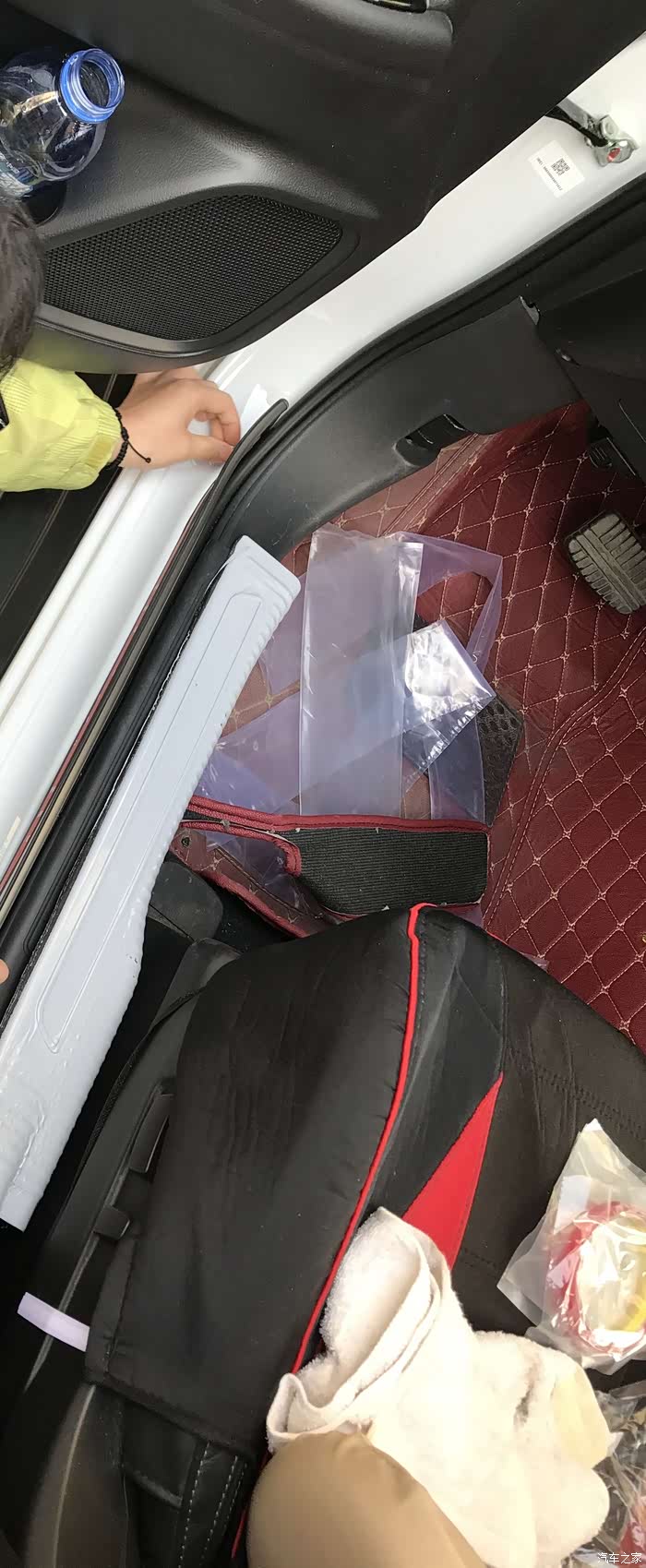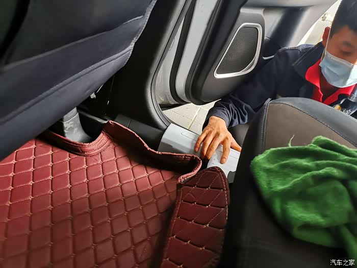 下面那个很好安装,基本上是平的,不存在什么难题。最近安装的是后排座椅边上空白的地方。贴之前先擦拭干净。