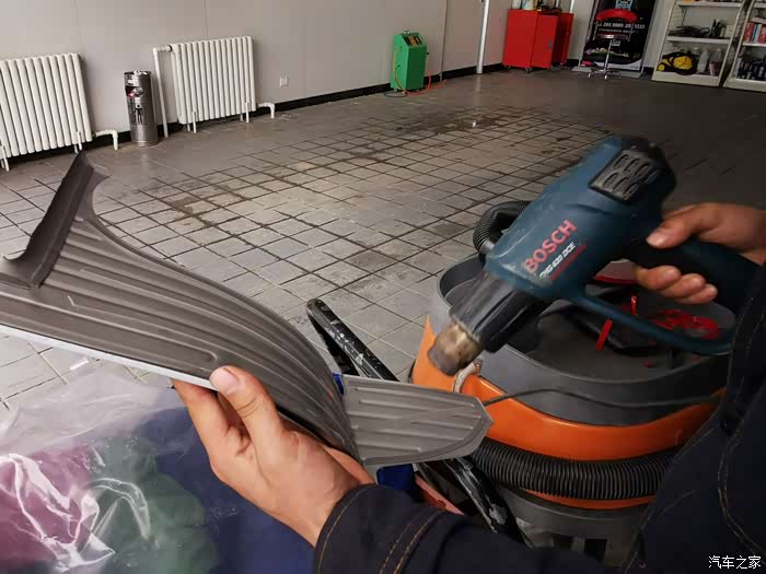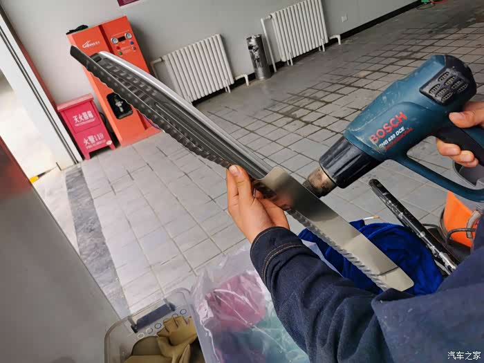 这个加热枪太厉害了,温度特别高。如果有条件的话,用吹风机也是可以的哈。车身上也吹一下,两边都加热。不能漫地里烤火,一面热啊。