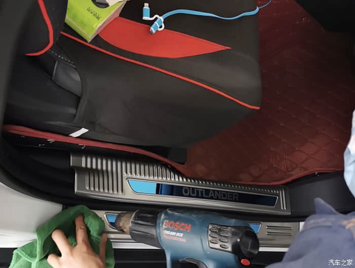 于是就把迎宾踏扔到了后备箱。这几天突然想起了后备箱中的迎宾踏,就决定去亲表弟那里把这个迎宾踏给安装上。他那里是专业美容的,有加热枪,安装起来应该会很牢固。所以给那些打算安装的朋友一个最最发之肺腑的忠告,如果气温低且打算自己安装的话,还是等到夏季或者有加热工具的时候再购买迎宾踏板。