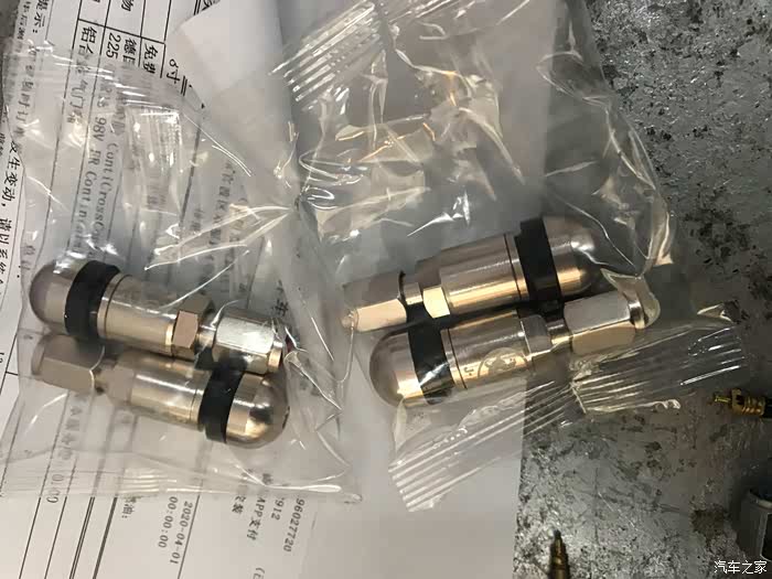 送的铝合金气门嘴,原装有胎压检测器,师傅说装不了,只能装包里了,可惜