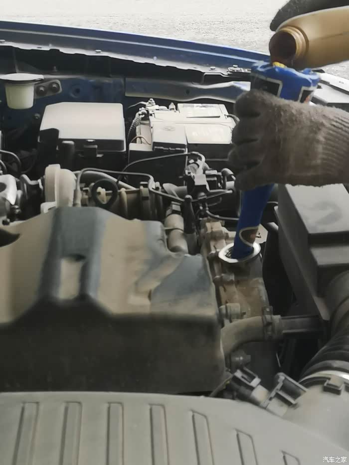 开始往发动机里加机油,如果手没准的话最好向我一样,弄个漏斗。加了六升刚刚好。加完拧好盖子就完活了。