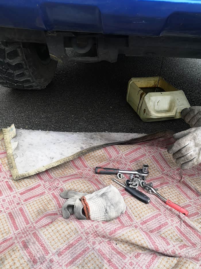 拧下下边的放油口开始放油,干脏活一定要带上手套,一层不行就带两层,否则脏机油弄到手上特别不好洗