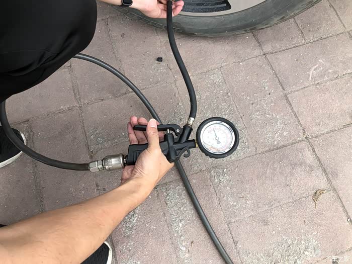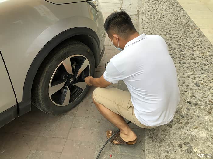 绕车一周后,发现车辆有个轮胎好像气不够,仔细查看了轮胎,没有发现扎钉的情况,可能是气压过低。之前上网了解过当轮胎气压过低时,胎体会变形增大,胎侧容易有裂口,会产生屈挠运动,导致过度生热,促使橡胶老化,帘布层疲劳、帘线折断。气压过低,还会使轮胎接地面积增大,加速胎肩磨损。换句话说吧,轮胎就像汽车的脚,而轮胎胎压则是轮胎上的肌肉,胎压不合适,就会影响汽车的正常行驶。
