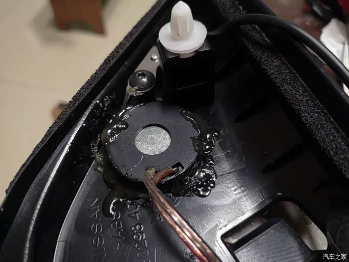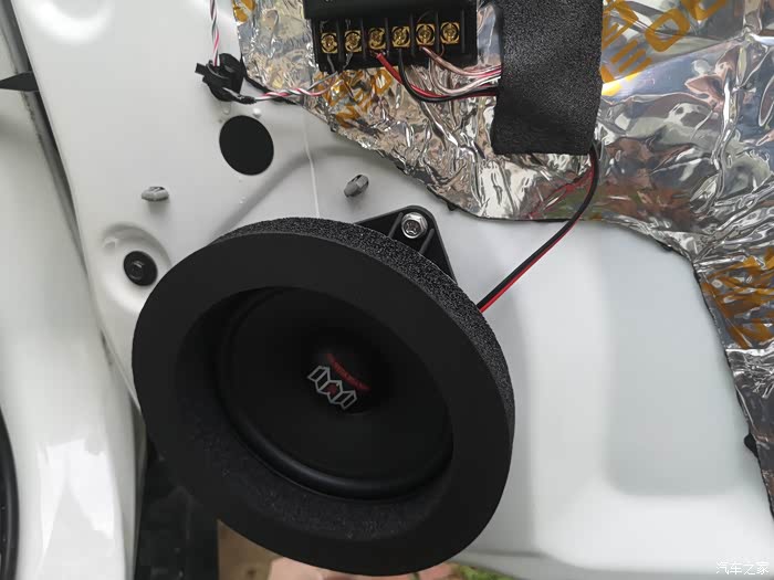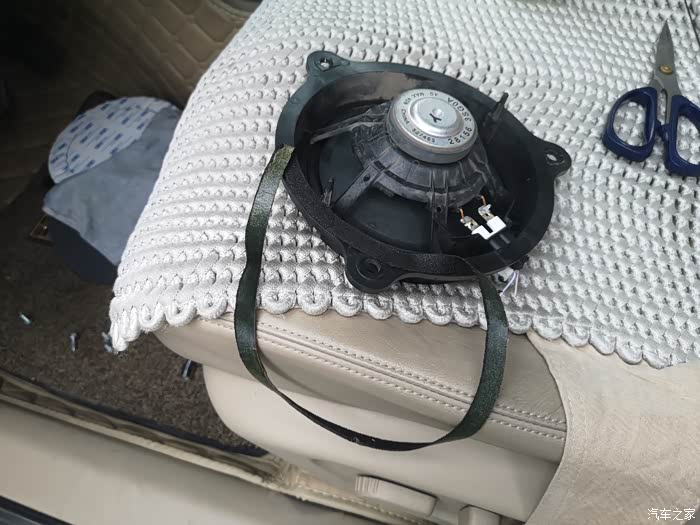 原车的袖珍磁铁喇叭。废物利用,防震垫利用上,聊胜于无。