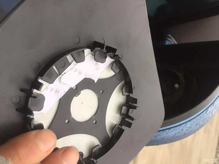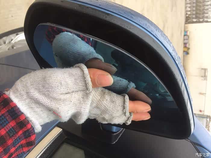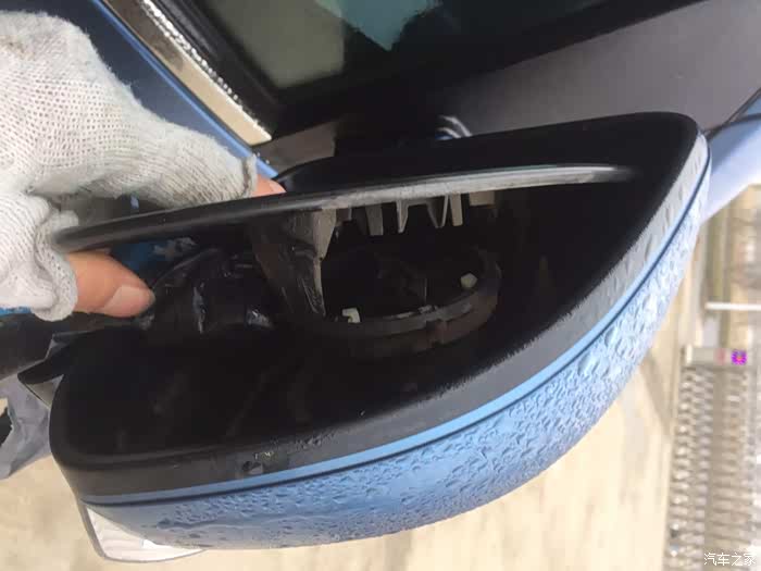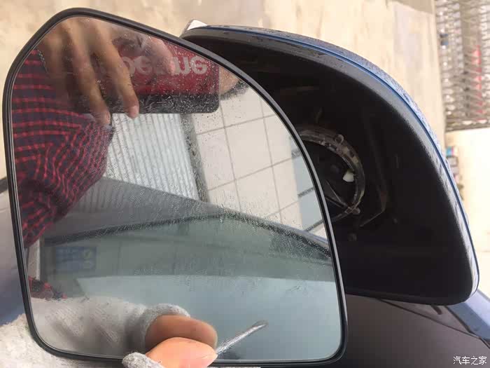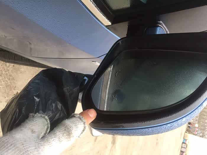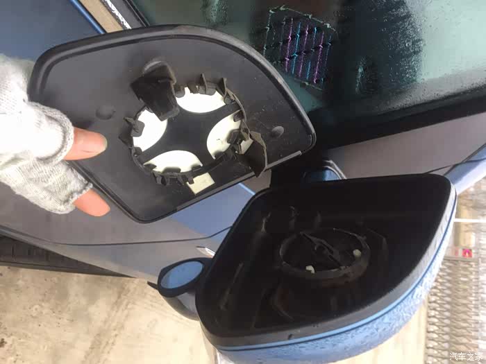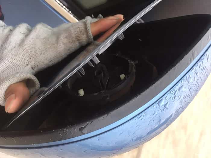4个打卡扣对上后视镜4个突出部位,慢慢按进去。要稍微使点劲,别使劲大了,待会让你按碎了