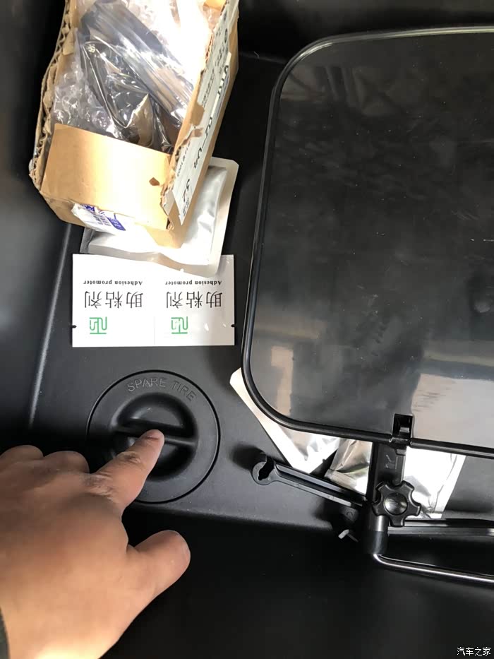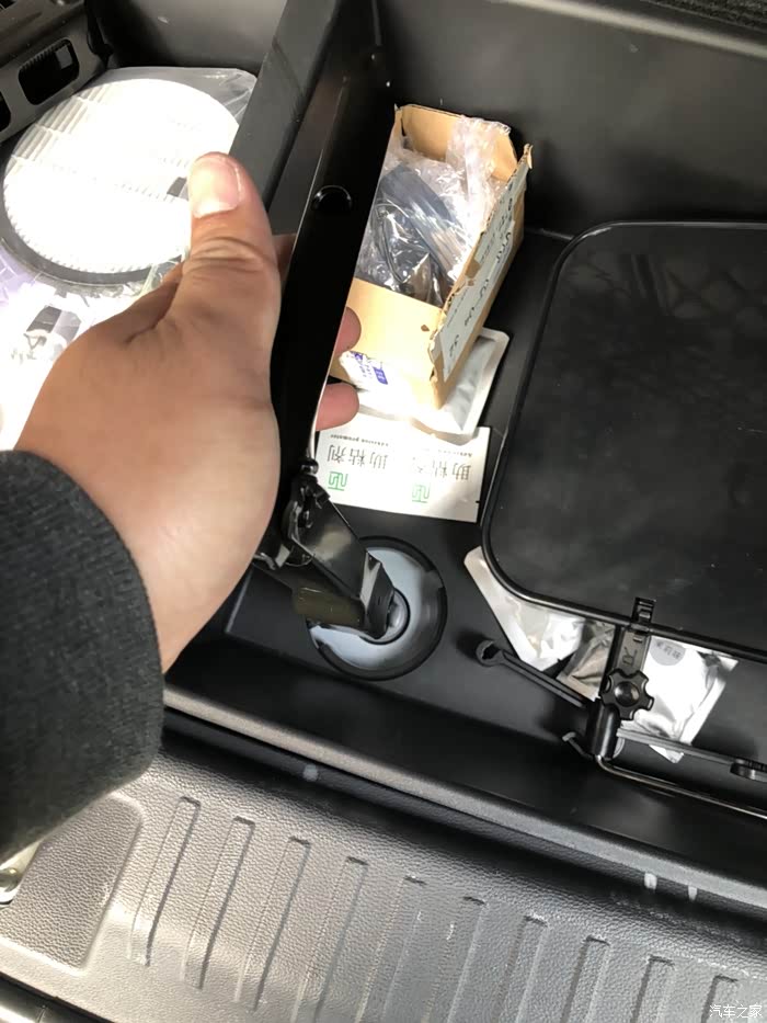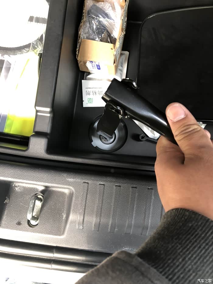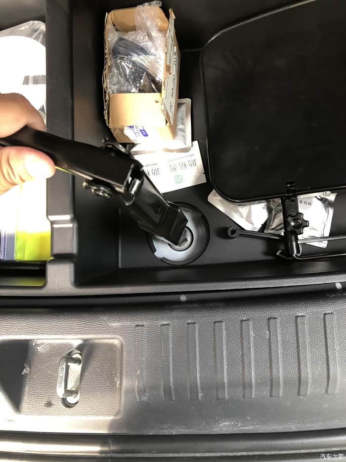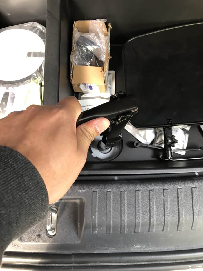 今天来教大家怎么使用随车工具换备胎。相信大家都应该有过轮胎没气需要换备胎的情况。虽然我们可以叫救援,但是万一没人来救你呐,有些本领还是自己要掌握的比较好。我们的车备胎在哪里呐,其实是在地盘下面。取下来的话要使用随车工具。里面有个套筒。打开后备箱掀起小板子在左边是工具右边有个可以拧的小圆盖,拧开之后看到螺丝用套筒套上去逆时针转动。