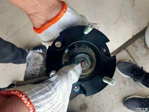 这是前减震器的垫块,减震三个螺丝先安装到这个上面,然后再把上面的3个螺丝安装到车上