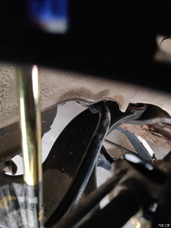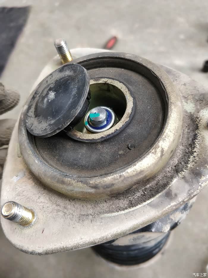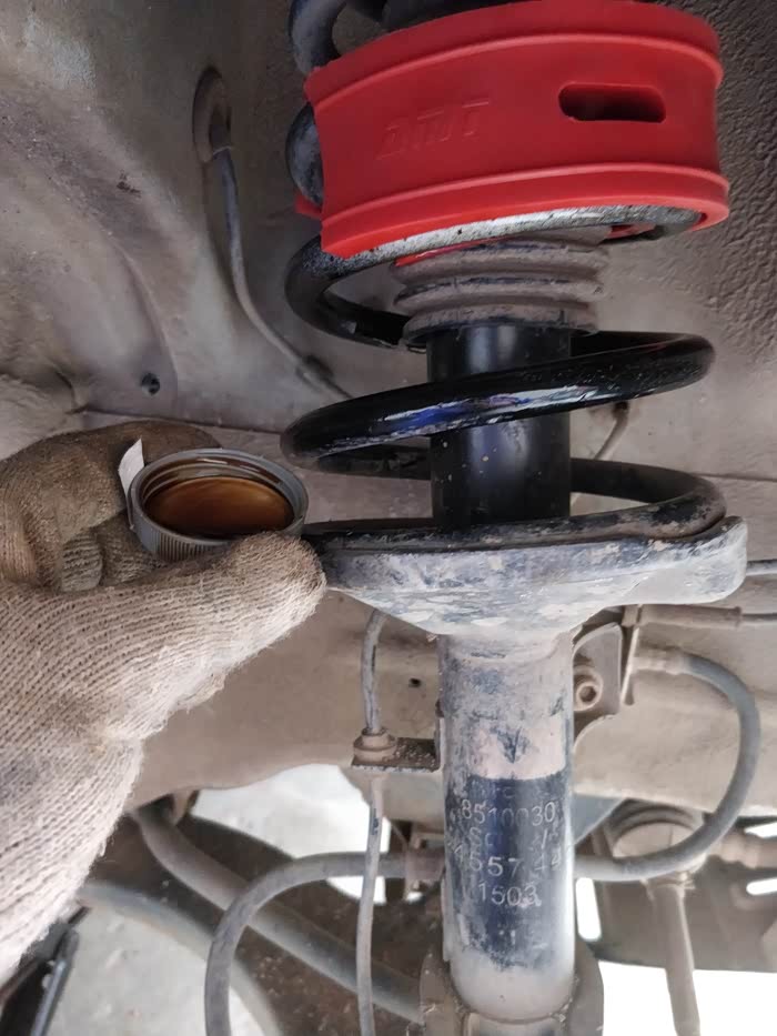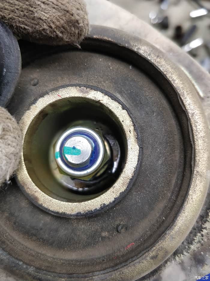 避震的螺母印记证明避震是未维修拆过的,然后里面竟然有油,看颜色可以判断就是避震油,再则,这里无论如何也不应该有油出现,这里是有盖子盖住的,然而保险盒这个地方整个区域都未发现有油渍的地方,那么这个油从何而来,为何会在这个密封的塔盖中,经过一番理论推断,八九不离十应该是避震因为缓冲胶碎了,没有了,避震长其承受大压力,导致避震塔顶塌陷,连带关系也就是避震也压迫泄油了,这种无从考证的东西也只有推理解释了,总之这次换避震,价钱和经验都很值得,价钱合理,还收货了一些经验,最后试车,如履平地的感觉真的值,如履平地可能有带夸张哈,但换前换后,的确是有明显行车质量质感上的差别的,过斑马线,坑,坎,是明显有差别的。这个差别是自己的车,就一定可以感受得到的,没有言词上的水分。