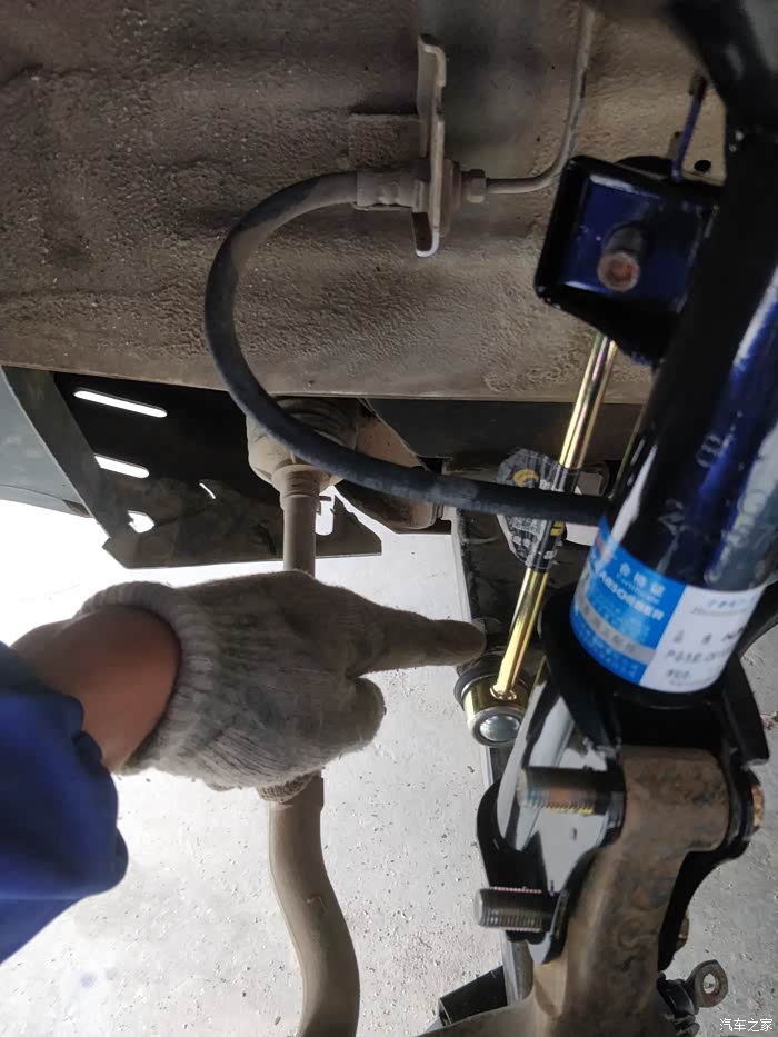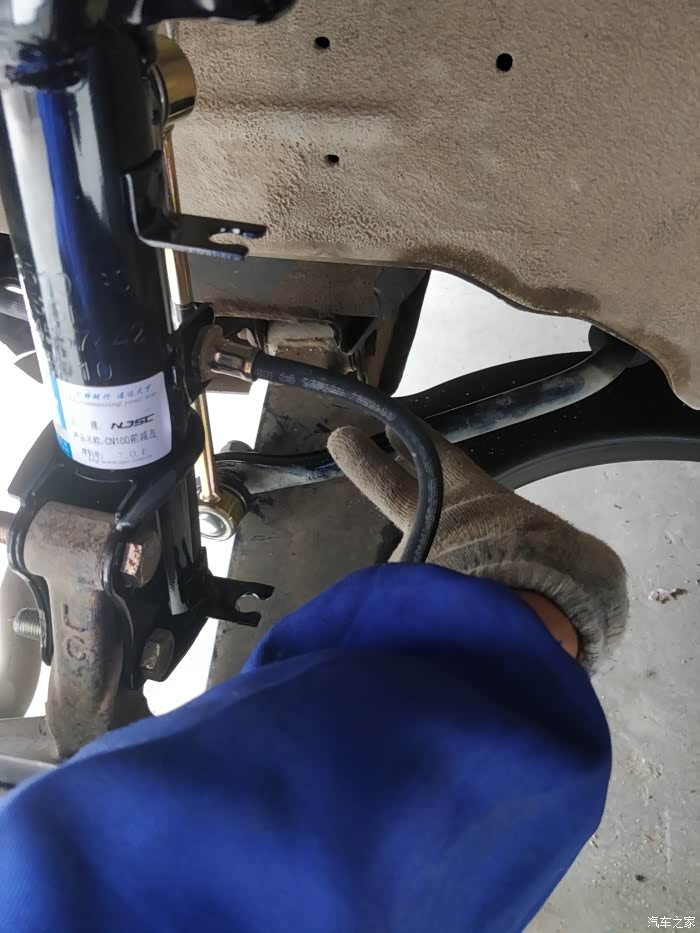 如果是更换避震的,是不需要拆掉拉杆的,切记,无需拆拉杆,只需要松掉避震上的螺母,用手出力按压图中白手套所指的拉杆轴,拉杆就自然松出避震上了,安装的时候一样,用力压那根轴,就可以把螺母穿到避震上了5