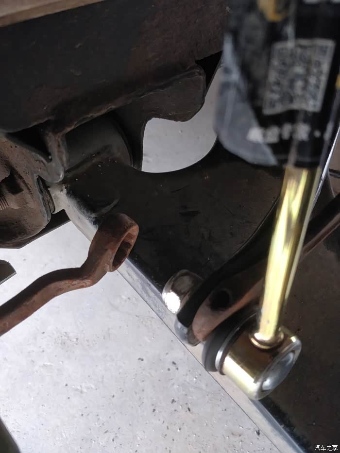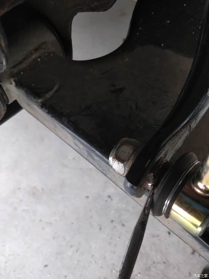 ,既然都拆了,就再分享一下拆拉杆的细节供网友自己动手换拉杆的方便,拉杆上端连避震,拆了螺丝就可以,下端连轴,拆这个螺丝就不好拆了,我刚开始拆的时候,用扳手转了半天,螺丝都未完全松出来,这里空间唉手,扳手也是刚刚有一点空间可操作。最后发现,下端的螺丝如果太紧了,拆的时候,它就造成了螺丝个拉杆芯一起转动,所以就造成我松了半天螺丝,都未见螺母退出来