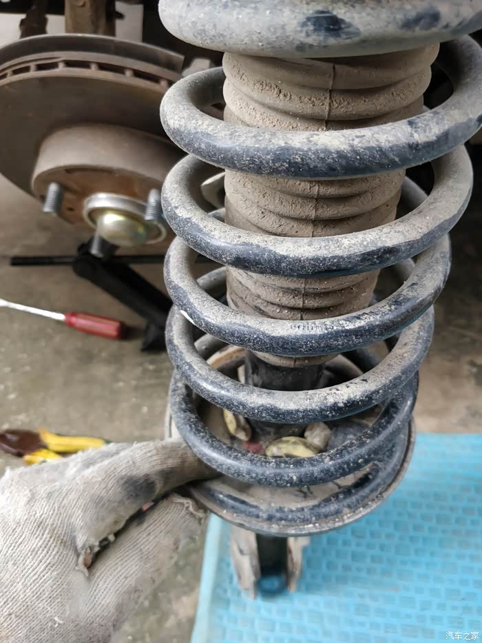 本次维护发现这边的避震缓冲胶也碎了,没有了,用手从头摸到尾都摸不到,所以判断肯定也是震碎掉落不见了。但是这边车身高度没有发现变化,所以先打算用到车先,抽个空买缓冲胶,买个塔顶,(车身高度没有变化塔顶胶应该没塌陷)买个工具拆弹簧,或者修理厂借一个(避震顶盖敲开看过,没有油渍)准备自己维修,手残党。