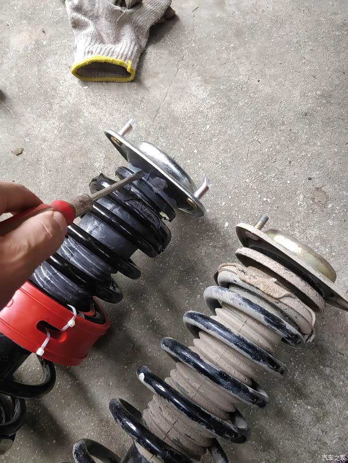 从图中手指位置可以看出来,新旧避震进行了长度高度对比,我问用尺子测量多新旧弹簧长度,发现,弹簧长度一样,说明弹簧并没有金属疲劳而塌陷,然而避震随没有了缓冲胶,但不至于影响到一边车身高度问题,经过仔细勘察,测量发现,减震塔顶三角臂没有新得那么高,旧的矮有一个手指距离,难怪未修前左右车身高度就差一个手指左右高度,原因不是缓冲胶碎而导致,实际上缓冲胶只是增加避震的寿命和舒适性,没有缓冲胶只会过斑马线,坑的地方都可以感觉车子的跳动像做船,就过人行道化的那种白线,都可以感觉到车底有明显的反馈感,这个时候你就要用手去摸一摸你的避震缓冲胶还有没有了哈,申手去捏捏就知道还有没有了