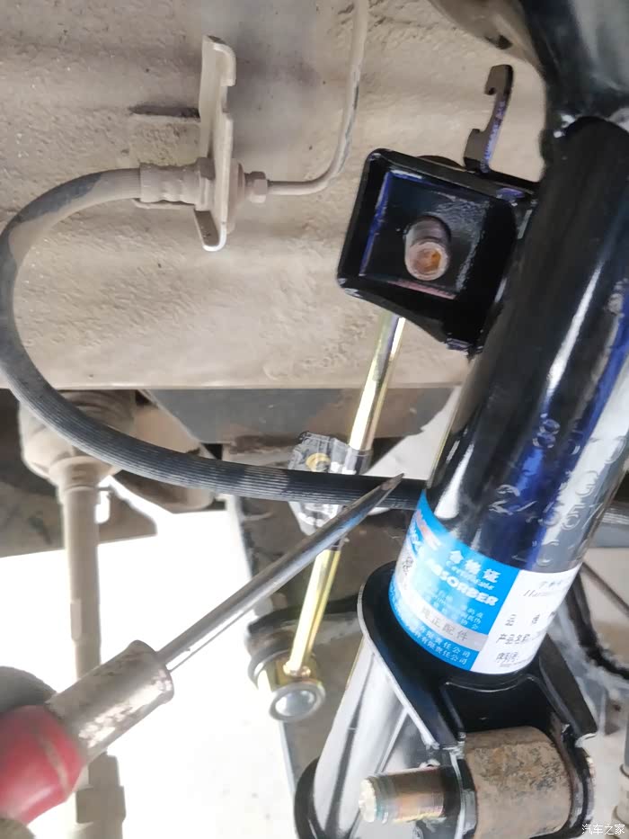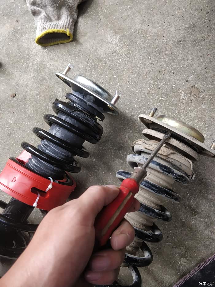 避震下图螺丝部件全部松掉就松塔顶螺丝,拿点保险盒就可以顺利松掉螺丝了。上面的螺丝松完,就到下面用手扶住避震,16 斤重,用一字螺丝刀把下避震大螺丝捅出来,避震就完全掉下来了!