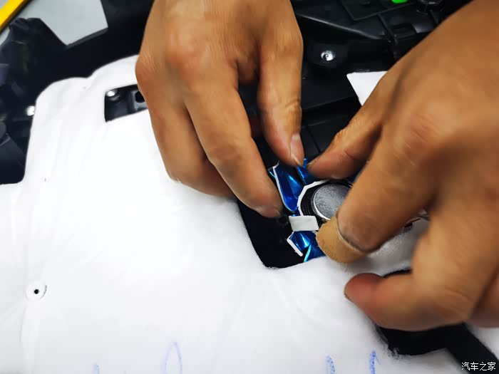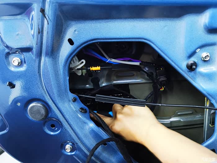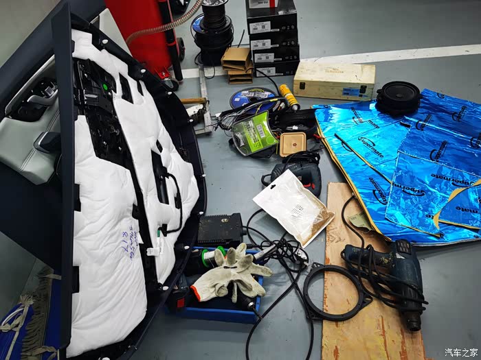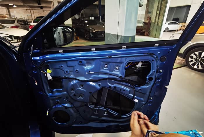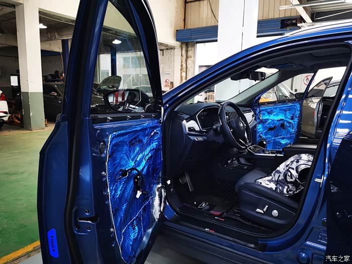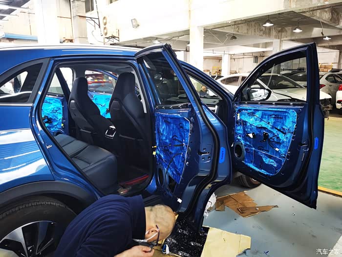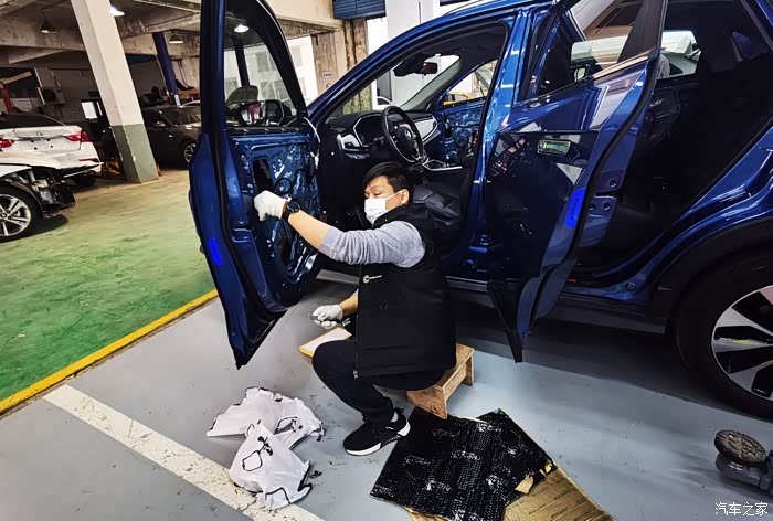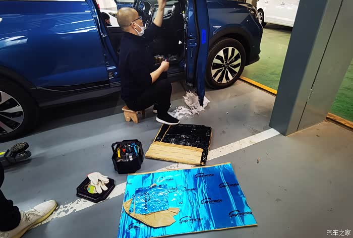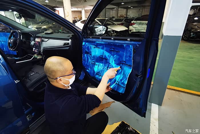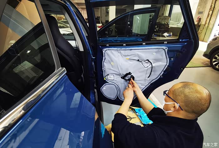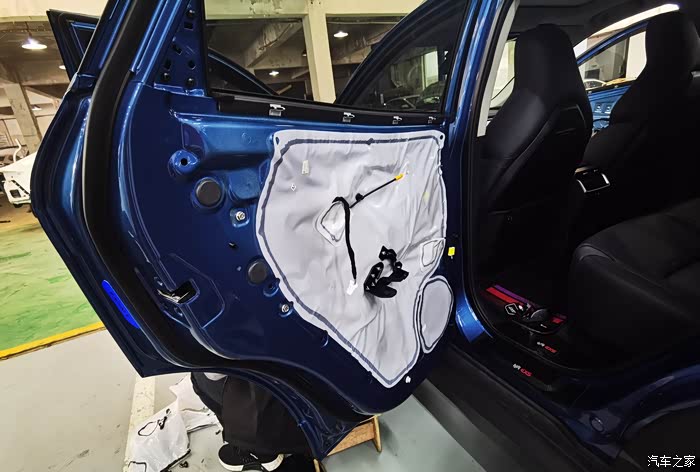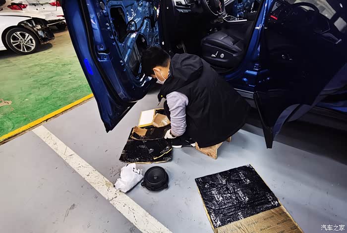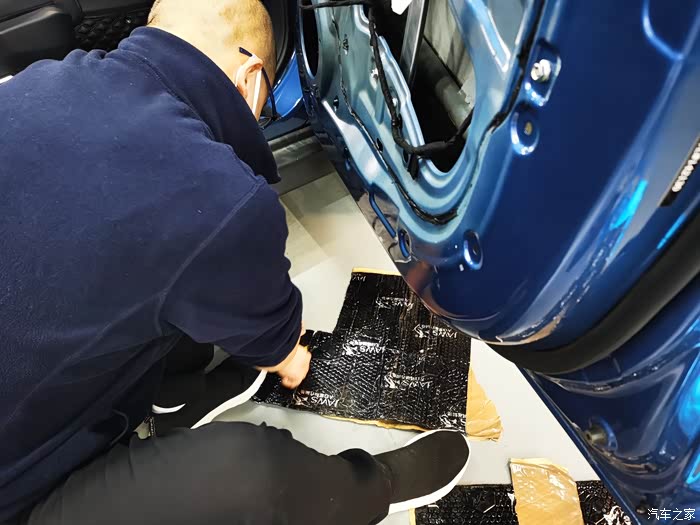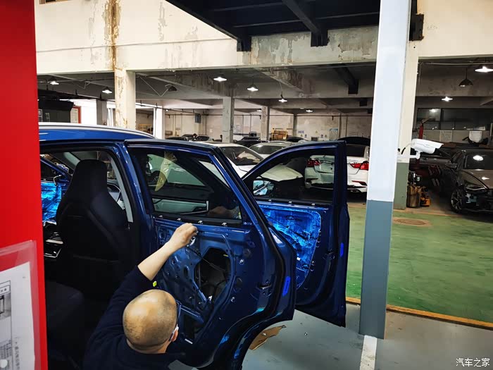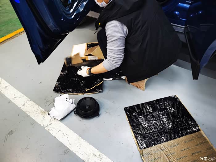 一大早就到4S店,工人还没到,找了空位停好,去售后休息了一会,没多会工人来了,是两位小哥哥,开始拆车,将4门门板全部拆下来,露出来的是防尘膜,原车没电隔音,我的奖品是4门隔音和4门音响,先是做隔音(可以增加音响质感),贴上隔音膜后还要用滚轮滚出波纹(避免平面发射的声音不好)