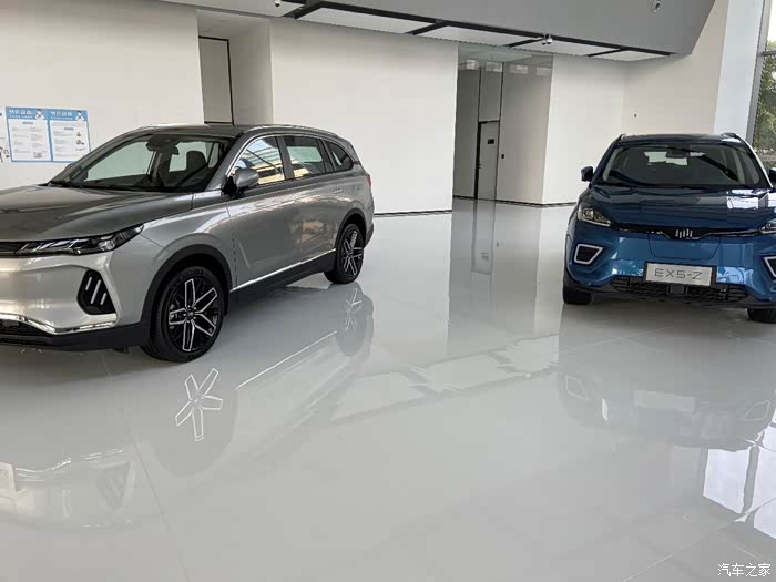 座椅着实让我眼前一亮,质感满满,坐上去很舒服。展厅内除了EX5-Z这台“蓝神”,还摆放了两台体型更加壮硕的EX6 Plus。