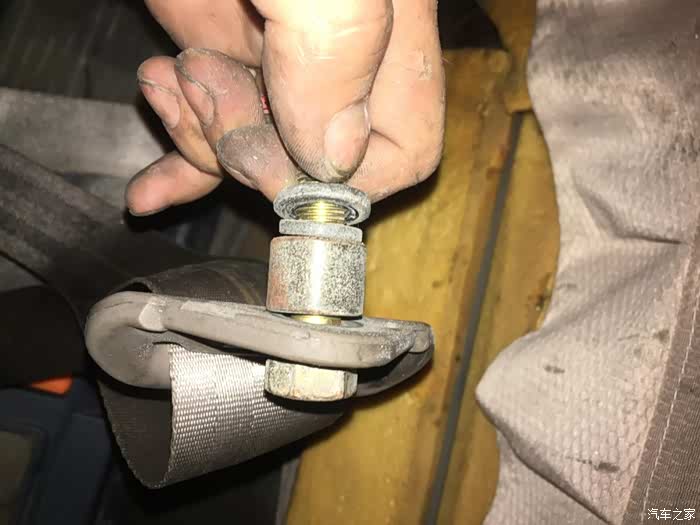 安全带洞口没拍,给大家看看安全带吧。为什么拍这个,这是我们拆车是要养成的习惯。关键不会要拍照。因为安全带太脏,准备吧螺丝取下来拿去清洗。有了这个照片我们在装回去的时候可以按照图片的样子把螺丝上的垫片按原来的顺去装上器