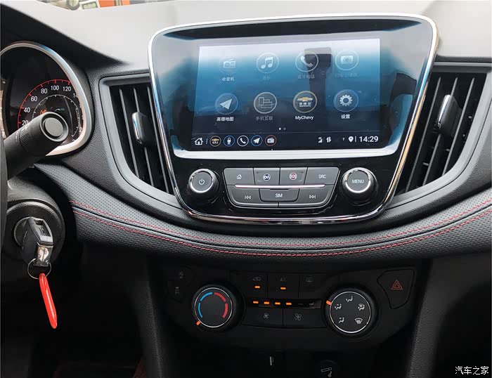 虽说功能键不多,但是每一个都必不可少,每一个按钮都有自己的使命,而且不会出现杂乱无章的感觉,这简直就是强迫症患者的福音。空调也是由简单的两个大旋钮组成,在驾驶的时候也可以轻松控制,中控屏幕擦的反光,哈哈。