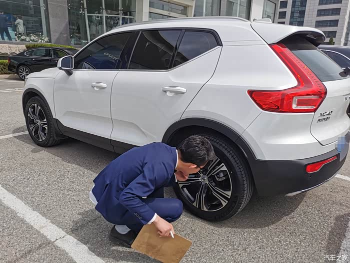 举起小沃,技师小哥先看了看底盘,又逐个给轮胎测了测胎压,缺气的补充好