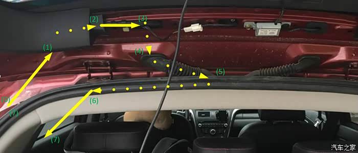 馈线按下面箭头方向走线(0)从行李架和后备箱液压杆方向过来的线(1)进后备箱内侧顶部塑料盖板,缝隙很大(2)向中央走线(3)进钢板的孔(4)进防水橡胶管,需要扣开防水塞(5)出防水橡胶管,进下方的夹层(6)夹层内向后备箱照明灯方向走线,找个合适地方从密封胶条内出来。