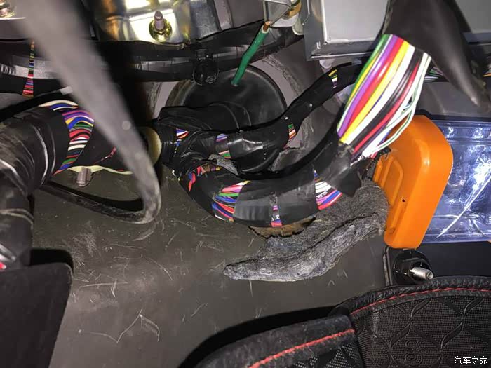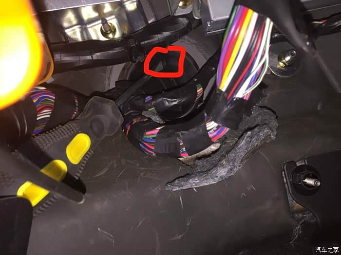 安装发动机舱防火墙穿线在奔腾X80方向盘下有一个穿线孔,照片中红圈位置,用螺丝刀从驾驶舱向发动机舱顶住,可以从发动机机舱放行用手摸到螺丝刀,可以感受到橡胶的厚度。从此处穿孔是比较安全的。穿线使用粗的单芯铜线,我使用6平方的单芯铜线,也可以用铁丝晾衣架的铁丝。使用硬铜线或者铁丝从发动机机舱向驾驶室穿孔。