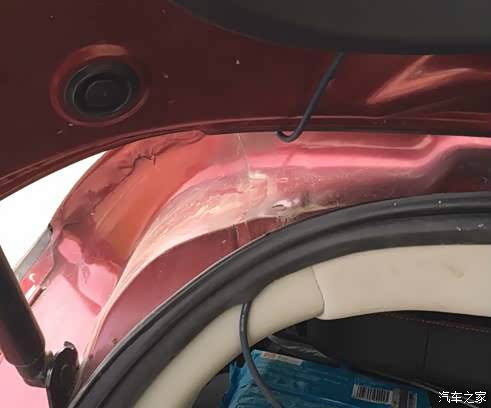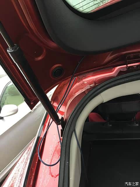 此处可以用捆扎带固定一下撬开后备箱盖内侧顶部的盖板,不需要用蛮力即可打开。