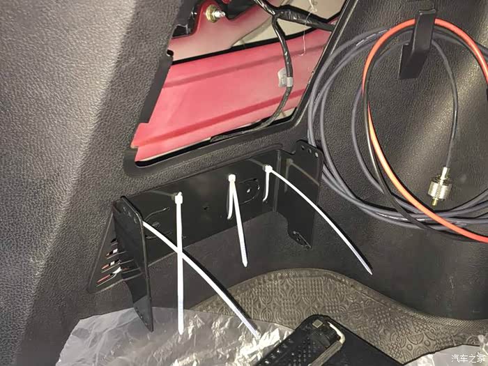 黄腊管或者石棉护线套保护电源线机身固定机身固定在后备箱左侧,直接使用扎带把机身支架固定,然后857D机身使用螺丝安装在支架上。