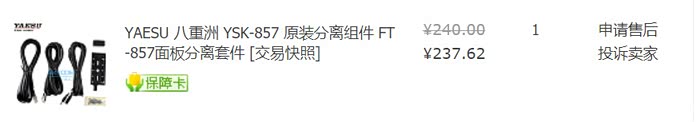 YaesuFT-857D淘宝FT-857D面板分离组件YSK-857单独购买的原厂分离面板组件,现在的正品FT-857D似乎包含了这个面板分离组件了。组件里面包含标准RJ45接头的网线直通线、4P4C的延长线、单声道音频延长线,一个RJ45延长插座,一块塑料的面板分离后盖,网络上有这个后盖的3D打印模型文件,估计能通过3D打印机打印出来,那就不用花200多买这套组件的。不过花钱节约时间也是可以的。