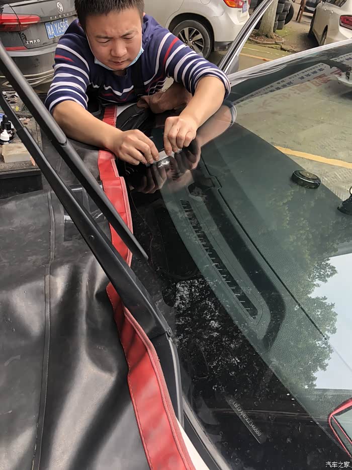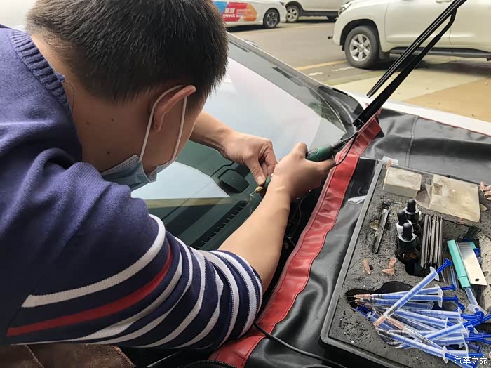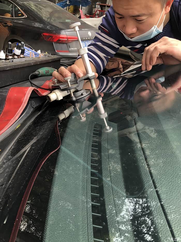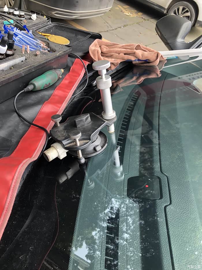 今天早上起来发现前挡风玻璃坏了、后面回想起来应该是前天自驾游回家的时候被石子蹦了、于是在网上查了查、前挡风玻璃出现裂纹的时候、前挡风玻璃破裂后、空气就会进入玻璃的夹层、时间长了有可能使玻璃夹层造成分离、并且汽车的车速越快、挡风玻璃承受的压力就会越大、裂纹的面积也会随之增大、挡风玻璃的裂纹增大、一方面会影响驾驶员的视线、一方面会给行车带来安全隐患、于是乎在车友群找了一个老哥修复的、谈好价钱就出发