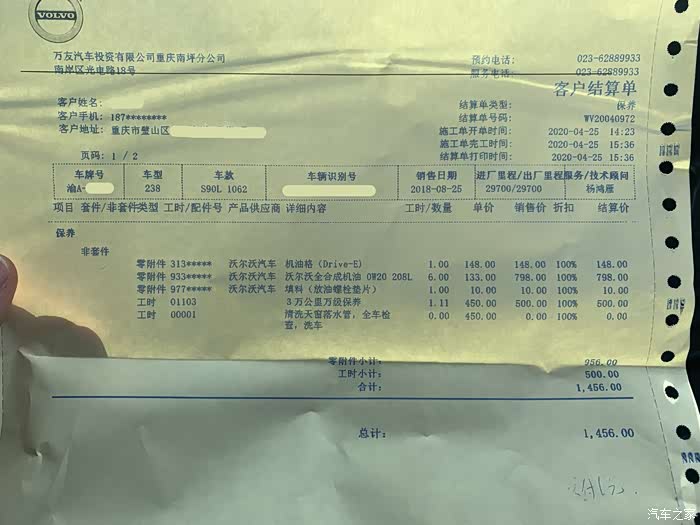 尽管疫情的阴霾没有散去,周末的4S店人多车多,几个工位都满了,因为在公众号上面提前预约,就把钥匙扔给售后接待,就告诉他基础保养,然后到休息室稍作休息。整个保养过程差不多1个半小时,基础保养的价格是1456(0W-20的机油),算上各种券和团购优惠,实际支付850元。说实话一万公里这个价格是真的良心,以前的速腾5000一保都有800多,所以沃尔沃的保养其实是真的不贵,如果用5W-30的机油价格会便宜200多,不知道黑沃尔沃养车贵的人真的开过沃尔沃么?这个级别的车修车都不便宜这是实话,毕竟很多零部件都是进口的,但是事故肯定走保险,也不会自己掏腰包,如果简单擦挂在外面找专业做漆的300-400一面,难道不香?由于沃尔沃追求良好的刹车性能,所以采用高端的陶瓷刹车片,这玩意儿唯一的缺点就是用得快,价格还不便宜。据反映有车友2万公里就已经需要更换了,技师专门给我查看了前后刹车片厚度,尽管三万公里但仍然剩余超过1/3,一万公里内仍然不需要更换,所以这个还是跟自己用车习惯和用车工况有很大关系,根据自己来选择是否更换全新刹车片。跟刹车一样,空气滤芯也是根据你实际使用环境来决定是否更换,如果你老是工地跑,肯定灰尘很多,需要及时更换,保障发动机正常工作。取下来才发现空气滤芯在3万公里其实已经很脏了,这个直接换新的吧,我推荐大家选择原装,如果你买大厂(如曼牌)的也行,但是价格真的差距不大,建议直接原装。最后,还是老规矩,先检查系统最新的版本,进行更新;检查全车电路电瓶,检查轮胎胎压和备胎胎压;清洗天窗倒水孔,添加玻璃水;……然后就洗车交钥匙。沃尔沃4S店的服务其实还是蛮好的,只是因为疫情,餐食换成了方便面呜呜呜……