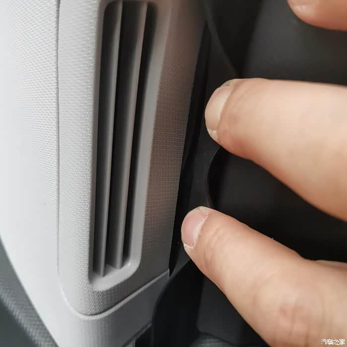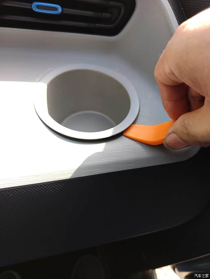 又也许是我劲太大了,杯座没拉起来,倒把仪表台提前拆开了。用的这个力,是抓住杯座向着副驾驶方向向上提拉,仪表台就开了,顺便可以打着手电研究一下仪表台的卡扣样式,对后面整体拆仪表台很有帮助。也正是因为拉开了这个缝,我试着从杯座底部,用螺丝刀顶住卡扣,愣是用这种方法把杯座拆了下来。