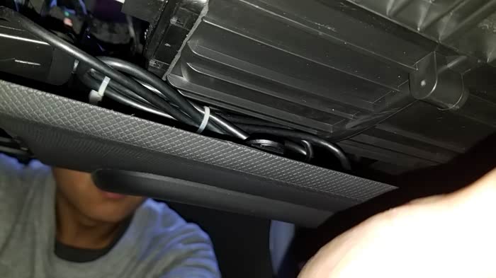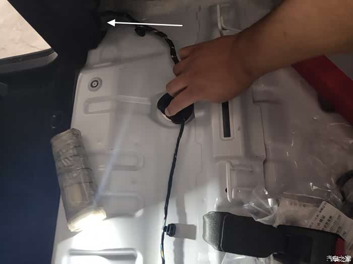 这里分享一点我的心得。我安装时是从仪表台一路往后跑线,沿副驾驶车门下沿胶条过来,要想到后排座椅下这个孔,中间隔着后排侧立面的一块挡板,线需要从挡板下塞进去。奈何这挡板下沿缝隙非常小,这里费了我九牛二虎之力,差点把线压断才装上。等装完才发现,如果反向安装,可以沿上图白色箭头方向,直接往前穿线就好,直接穿到副驾车门下胶条处(可能需要拆副驾下门槛护板,都是卡扣的,掰开就好)。换句话说,从上面白色箭头处开始跑倒车影像的线,分别往前和往后跑线。