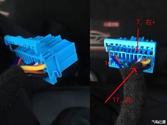 这是论坛前辈的指导图,感谢指导并抱歉未经允许引用图片,还是为了众车友安装方便。上面的车机尾线插头,接好副驾音箱线后,正极接7号口,负极接17号口,通电试听,再也不是收音机音效了。