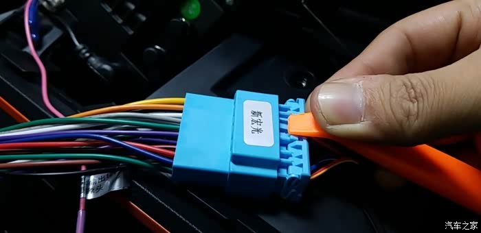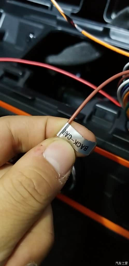 回到仪表台,倒车影像黄色圆形插头对接完毕后,还要接通倒车影像线,就是上图这个线头。线束上基本都带中英文标签,对照接线即可,店家指导很精准,不会出错。