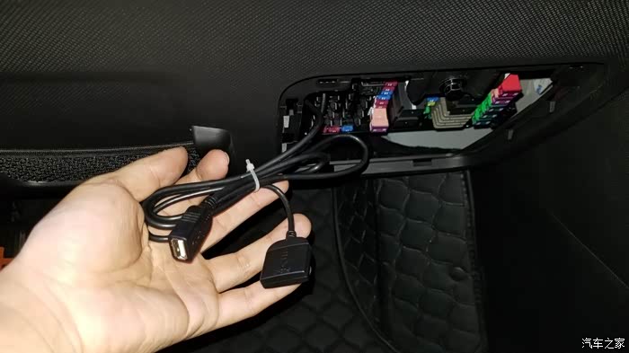 这是把手机塞到副驾驶脚底反手拍的照片。我把四针USB口和4G卡槽藏在副驾驶脚下挡板上方,找了个粘钩,不用的时候挂上面,用的时候掏一下就拿下来。很方便。