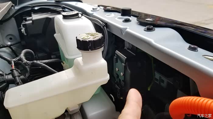 蜂鸣器降低音量。第一张图,打开发动机盖,两个白色水壶的前面,我手指的地方,就是蜂鸣器,30码车速内嗡嗡响的那个家伙。