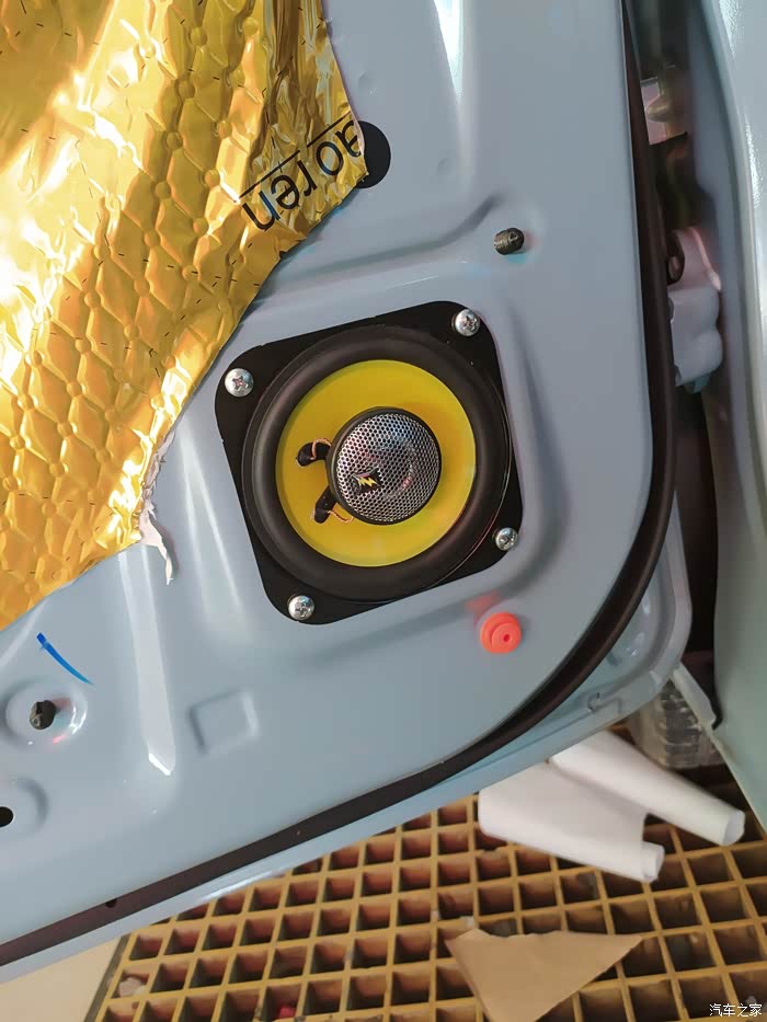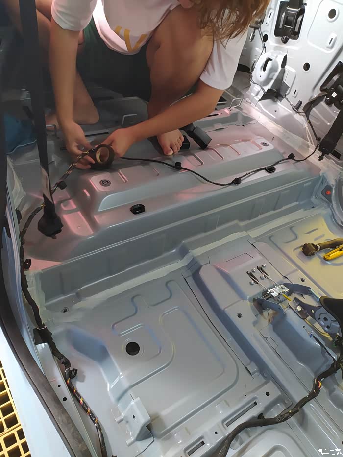 下午14点,车内隔音完成,敲地板再也听不到钢板的匡匡声了。开始弄门喇叭。由于副驾侧没线,所以得再另接。电气的不懂。反正老板挺熟练的穿线,焊接喇叭,接收音机。