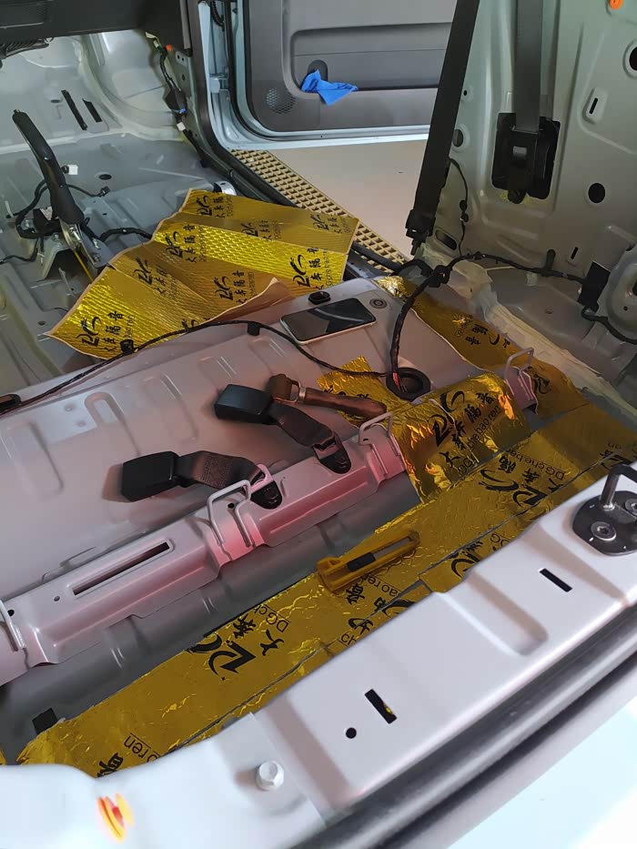 第三就是大家都比较关心的隔音效果。这个怎么说呢。如果是原车胎的话,本身胎躁不是很大。但换了胎后,这个胎噪声还是比较明显和吵杂的。而且避震比较硬,车厢内的共振也相对明显。没做隔音前,举个栗子,就像人在一个铁皮棚子里听下大雨的声音,哗哗的。而做了隔音后,效果并不是大家想象的图书馆级静音,那种是绝音,不是隔音。刚才说了,由于避震的缘故,振动的传导。胎噪还是有的,共振也是有的。但是对比没做前,这种噪音是得到了有效过滤和抑制的。从哗哗的铁皮棚子走进了一间木板房子里的感觉。声音分贝低点,变得柔和些和有序一些。轮胎在比较好的铺装的沥青路上,是沙沙的滚动声和呜呜的电机声。在不是很平整的水泥路面上,车厢内声音是避震传导的闷闷的轰轰声和呜呜的电机声,不算吵杂。以上就是比较主观的听觉感官和驾驶感受。