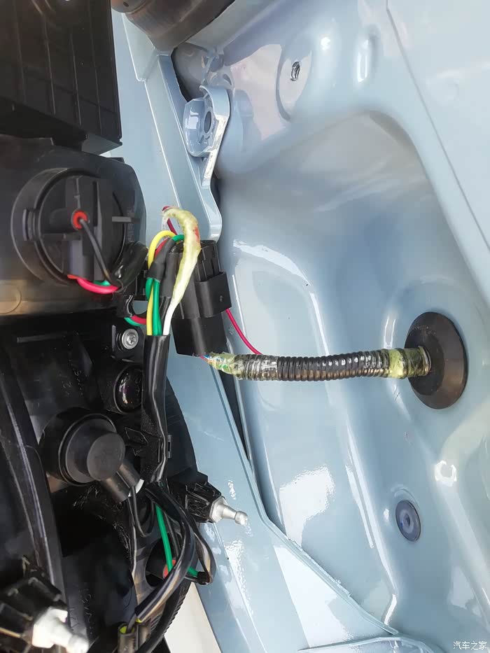 接倒车灯泡上那根白线就行了,纵向破个小口缠上,再用防水胶布粘好