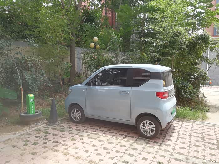 和充电桩在一起,防撞的旧轮胎下方打了一圈孔,预备下雨漏水,还有个废雨衣,回头给充电桩罩上,就没什么心事了。