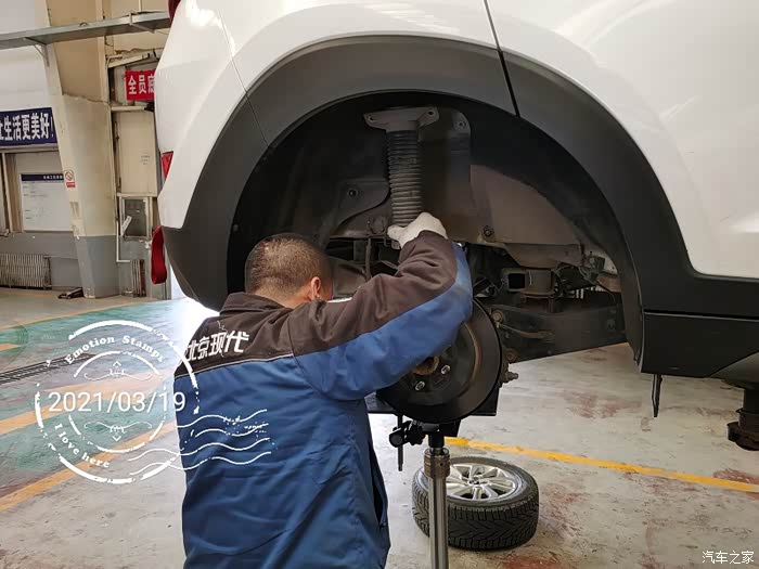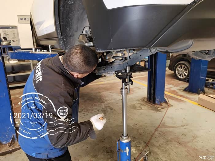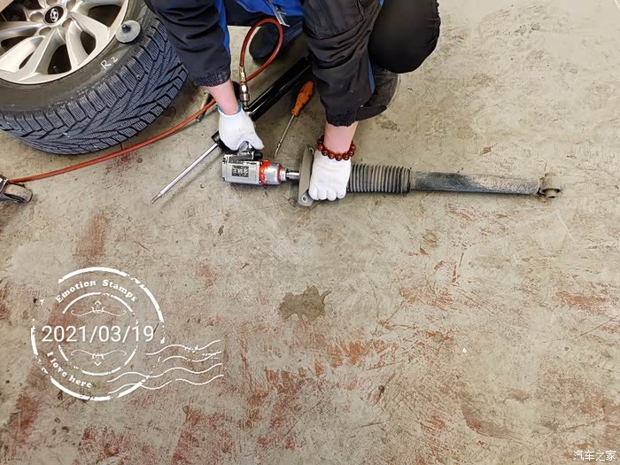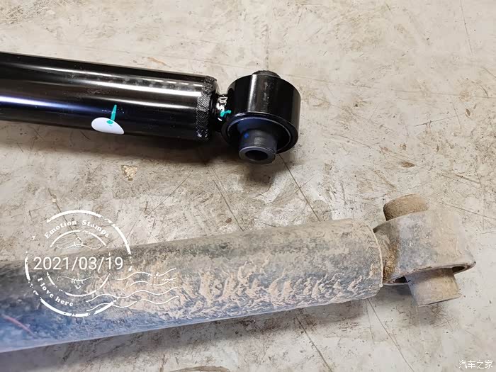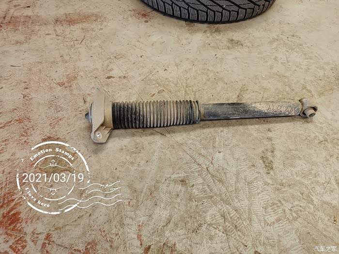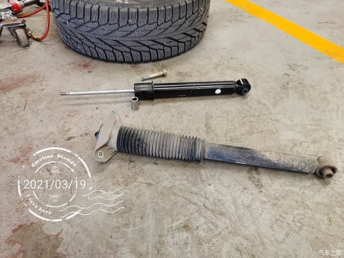 因为之前换轮胎的时候,发现了左后减震有轻微渗油现象,所以心里一直有着一个疙瘩。前两星期想,快5年了,要出质保了,要不要把能免费更换的零件都换一换呢?于是,到4S店找了维修师傅和索赔员商量了一下。决定换了后边漏油的减震器。但是仔细一琢磨,这玩意只换一只,另一只不换,会不会出啥问题呢?于是店员问我,另一只减震有没有啥问题?我想起来,过减速带后减震会有像漏气的声音。