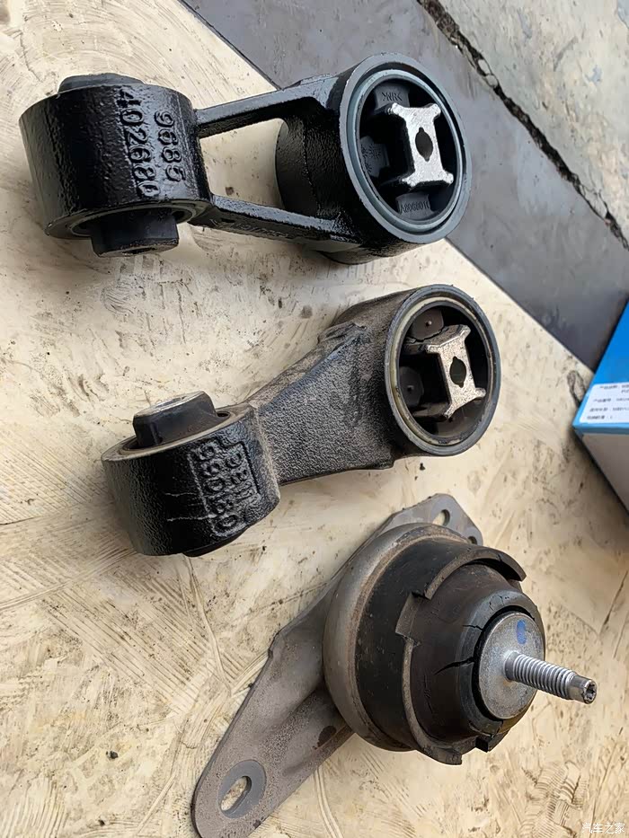 发动机左侧机脚一个,拉臂一个。(均已老化开裂,症状就是抖动)