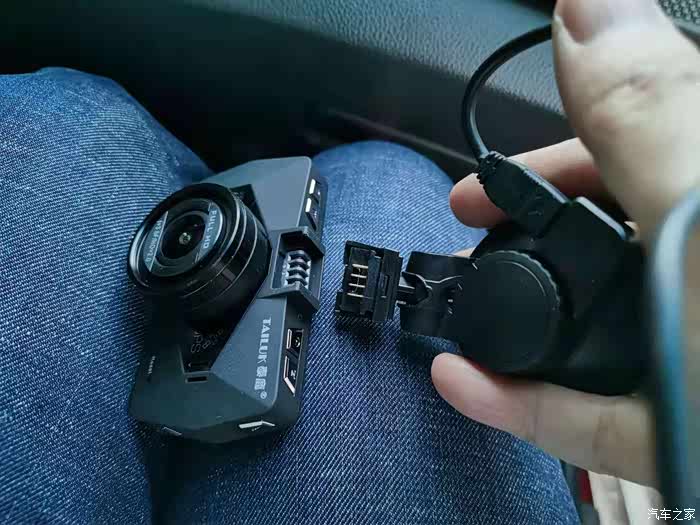 这款记录仪设计的比较特殊,电源是从固定底座上接入的。