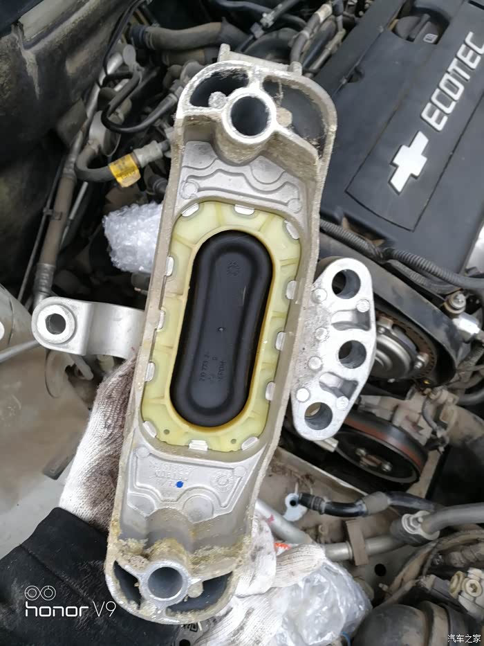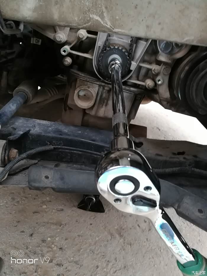 发动机油底壳下面再用千斤顶支起来,记得垫个木头,别把发动机油底壳弄坏了。