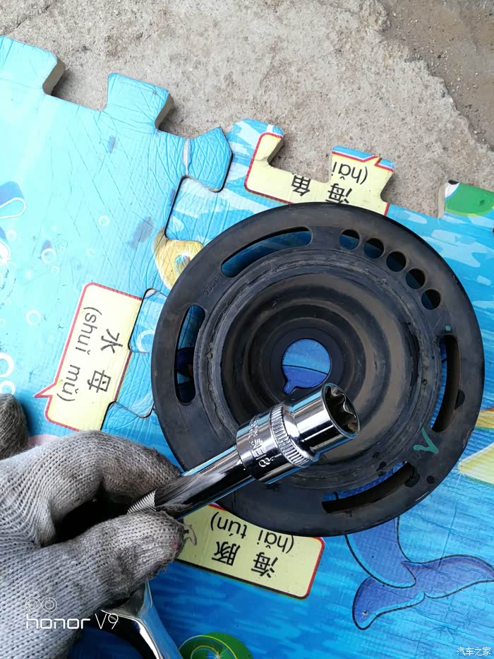 E18花型套筒拆掉曲轴螺丝,拿下飞轮。