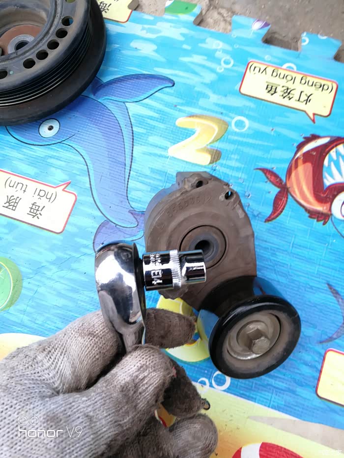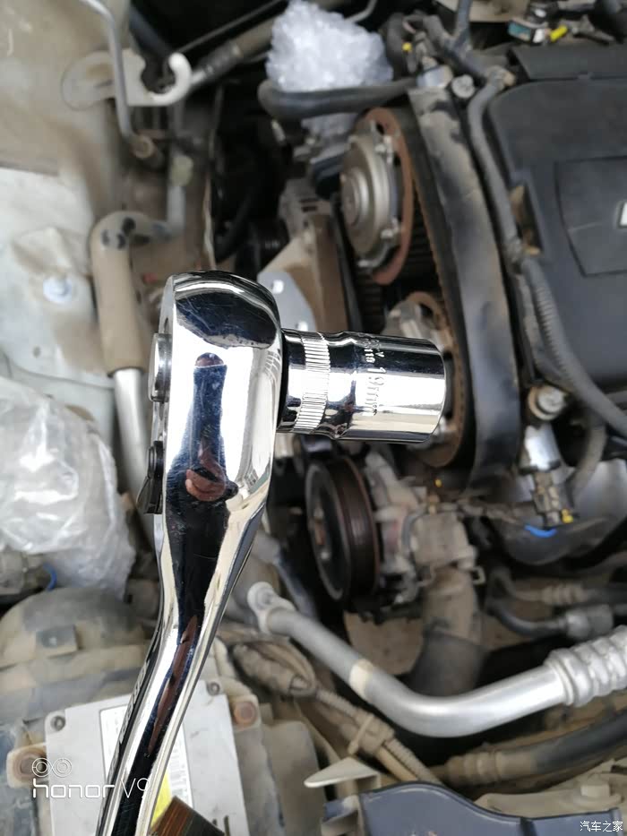 用19套筒的扳手压下发电机皮带涨紧轮,拿下发电机皮带。
