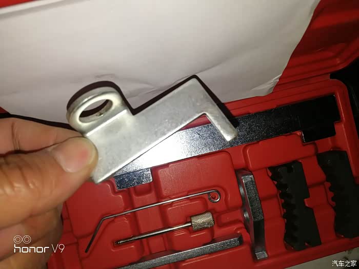 然后再把那个锁曲轴的专用工具装上,锁死曲轴,就可以装正时皮带了。记得先装曲轴那里,用手拉紧点,丛右面往左面装,最后把皮带放到涨紧轮那里,用内六角压下涨紧轮,再装上就行。