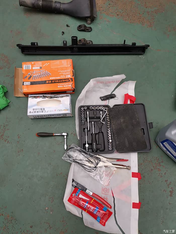 准备的工具和胶,已经把进气口给拆下来了,强烈建议大家在自己修理的时候把工具和拆下来的零件和螺丝都按顺序摆放后,容易找得到,不乱。