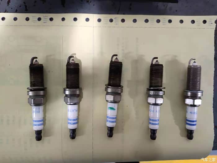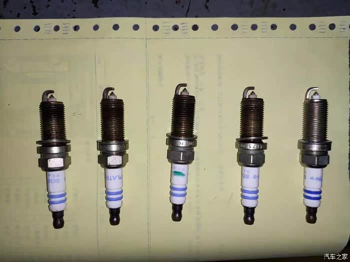 左边四个是拆下的火花塞,螺纹上略有积炭,燃烧程度不出我所料,烧的非常好,电极间隙也合适,最右边是新的火花塞,和原车一模一样的型号,三水家买的,4个是80+,小哥说他们店里也就卖30+一个。
