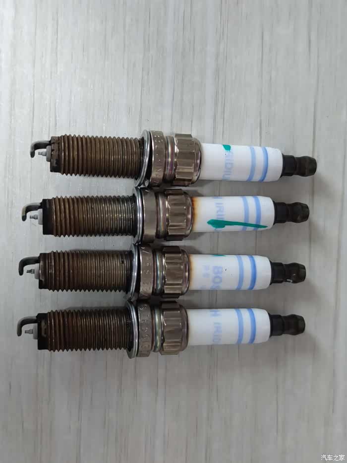 拆下的4颗ZR5SI33,从上到下依次是1-4缸。4颗都有薄薄的积碳片,油大都是中石化95,7000km用一瓶原厂燃油宝。2-3缸明显积碳较多,特别2缸陶瓷体发黄,咨询说因为高温,在6T机器常见。