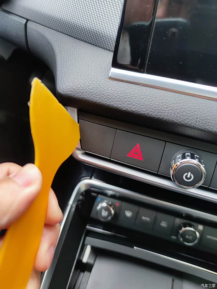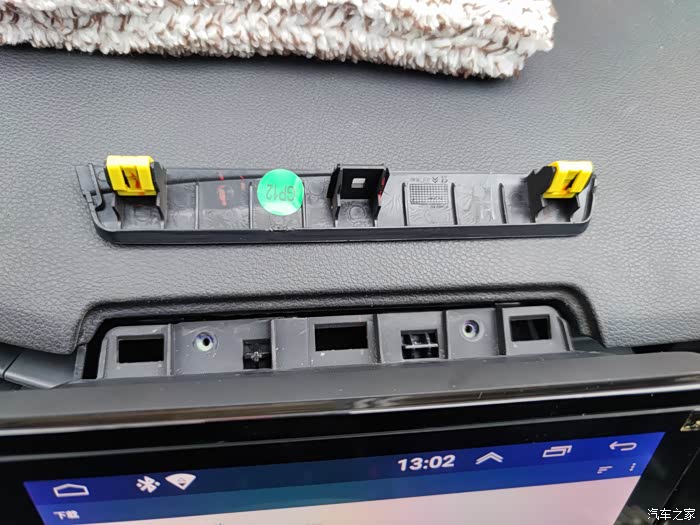 第三步,走线。这里没拍照了,副驾空调出风口和卡夫拉纹理饰板是一体的,直接从屏幕后面那一侧往自己这边掰就拿出来了,卡子和上面的黄色一样但是铁质的。